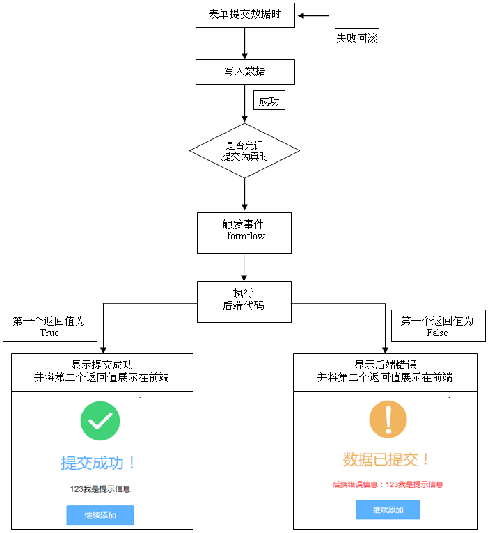 触发事件后,前端页面会将"当前表单别名","表单数据信息","数据提交类型"传给后端对应的云应用中的"_formflow"函数,然后执行"后端代码"并返回"返回结果"和"需要界面展示的数据"。