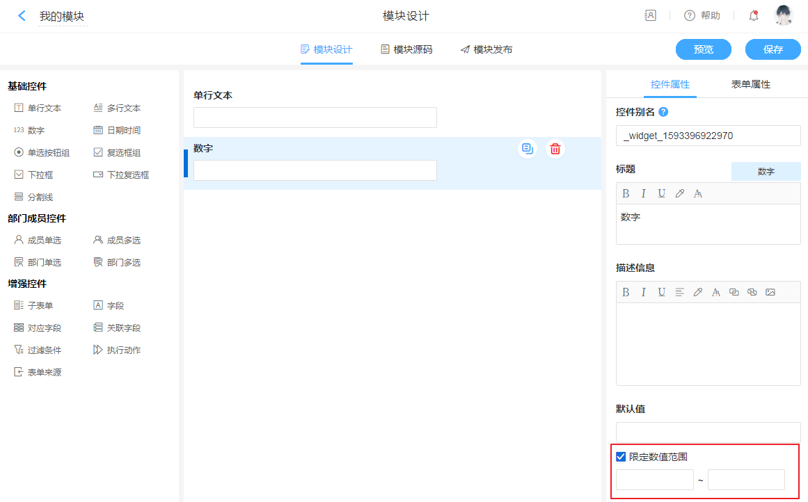 数字字段的字段属性除了新增了【操作权限】外,还可在字段属性区限定数字字段的数值范围,限定后输入的数字只能在此范围内,不在范围内会报错。