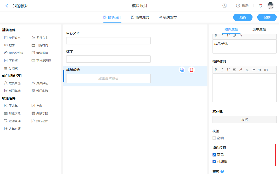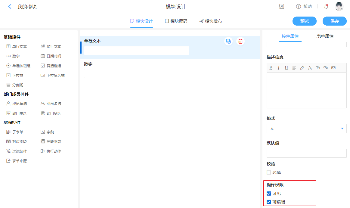 基础字段包含中的单行文本、多行文本、数字、日期时间、单选按钮组、复选框组、下拉框 这些字段的属性新增了【操作权限】,操作权限分为可见、不可见,此操作权限是为了应对特殊场景给与字段是否可见。