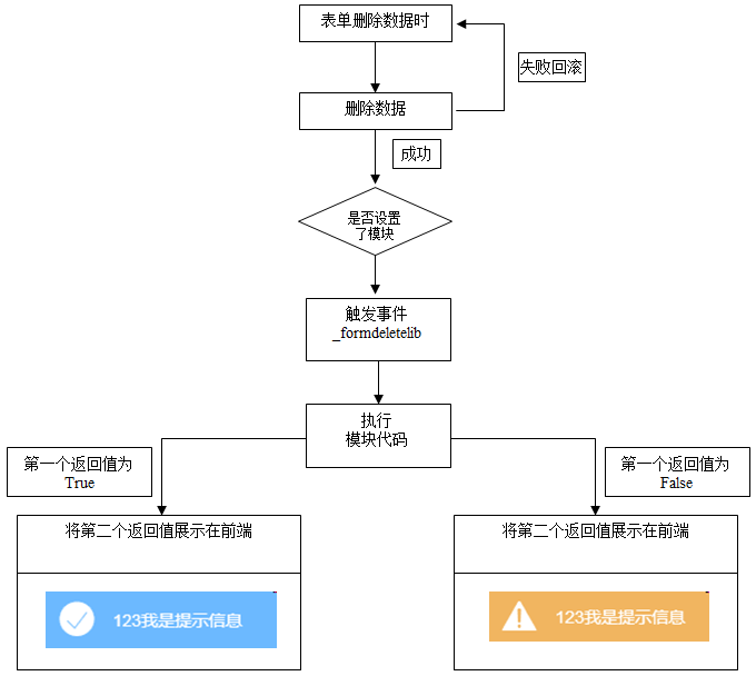 触发事件后,前端页面会将"当前表单别名","表单数据信息","数据提交类型"传给后端对应的云应用中的"_formdelete"函数,然后执行"后端代码"并返回"返回结果"和"需要界面展示的数据"。