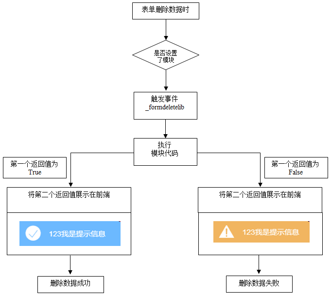 | 前置返回 | False:拦截删除操作 | 前端展示文本信息,为空无提示 |