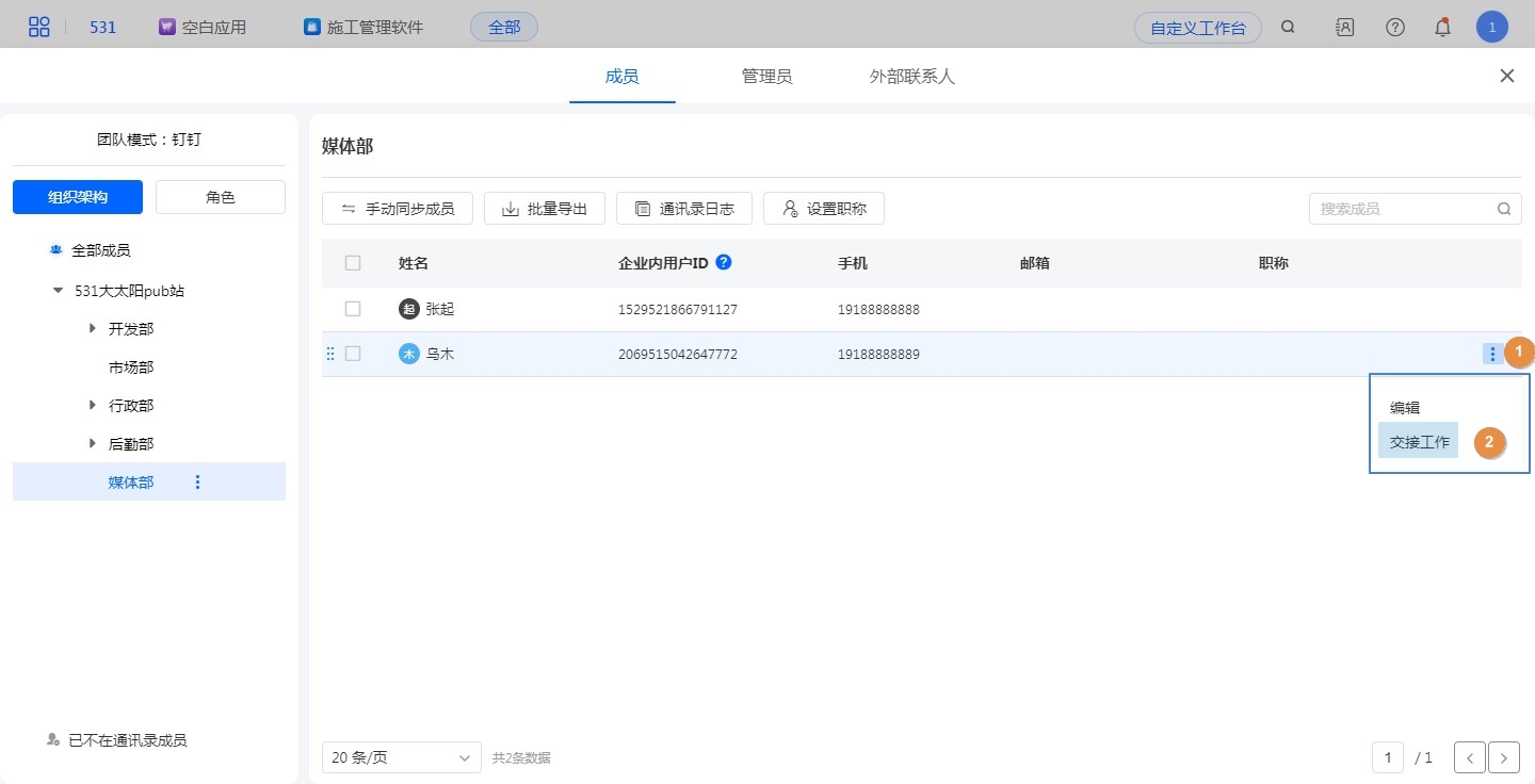 企业成员离职后,在钉钉通讯录操作成员离职。自动同步或者手动同步后,即可在「离职成员」界面看到已经离职的成员信息及其负责的工作并进行交接。