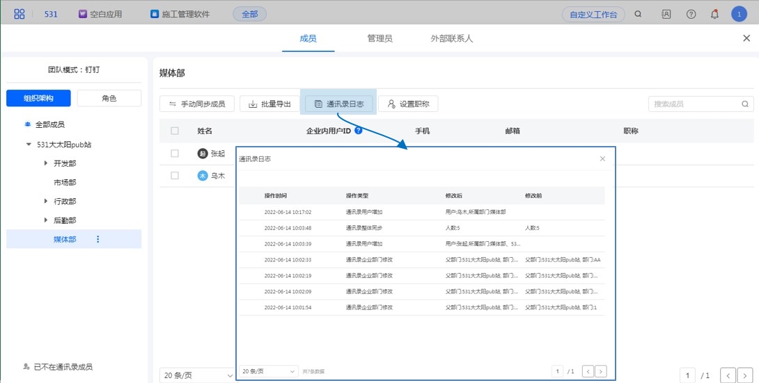 六米云账号和钉钉绑定后,通讯录会自动同步成钉钉团队的组织架构和成员,之前的通讯录会被钉钉通讯录替代。