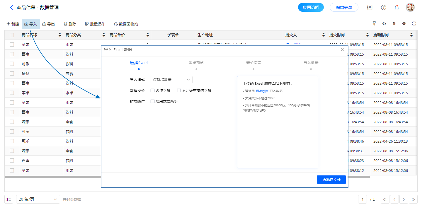 导入更新即仅更新数据,适用于对已导出的Excel数据进行修改后再次导入,即将excel中已修改的数据更新到表单。