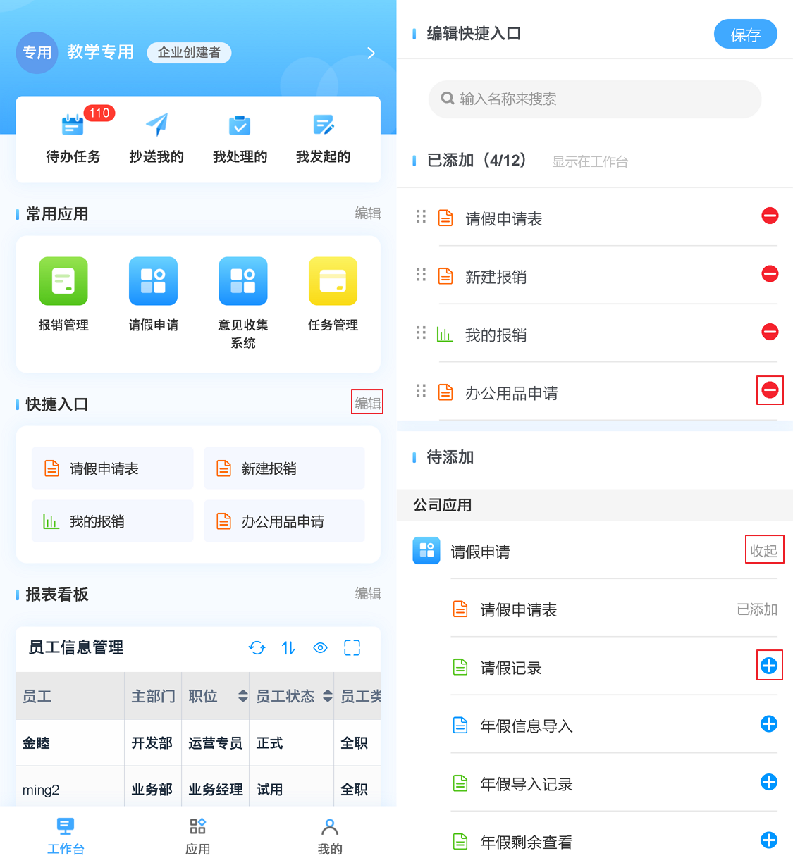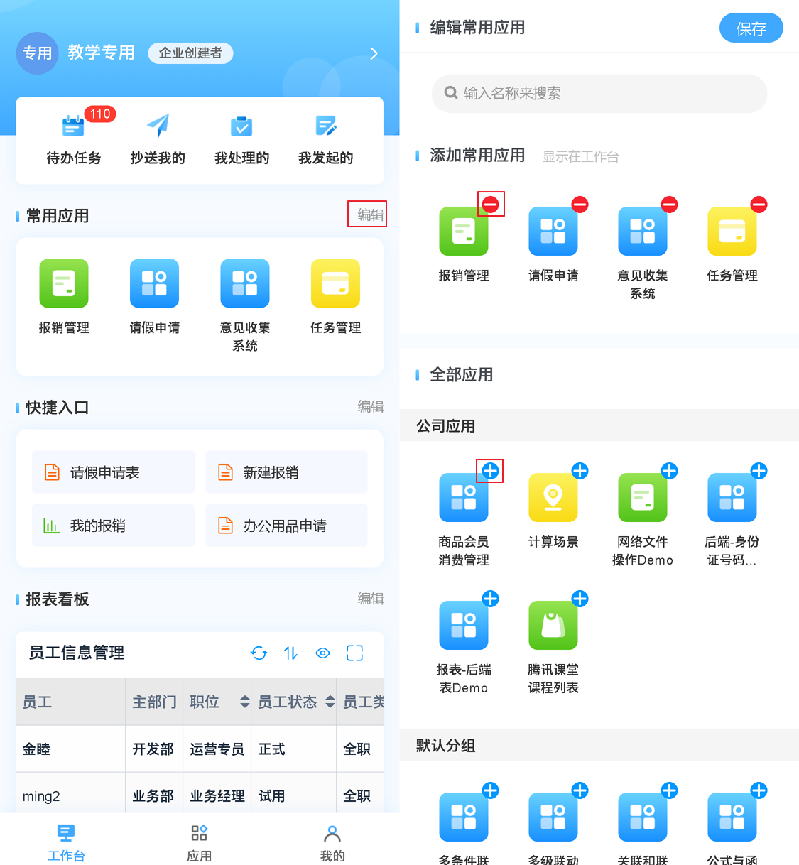 在移动端首页,可以自定义显示哪些应用,常用应用数量没有限制,但是因为在常用应用中没有搜索功能,所以建议大家合理分配常用应用的位置。