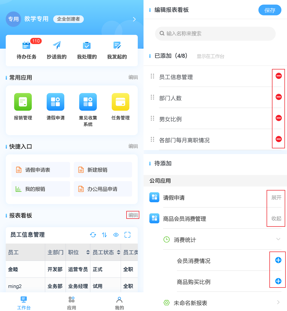 在个人中心可以对工作台内是否展示某些模块,还可以在工作台内编辑每一个模块的具体显示内容。