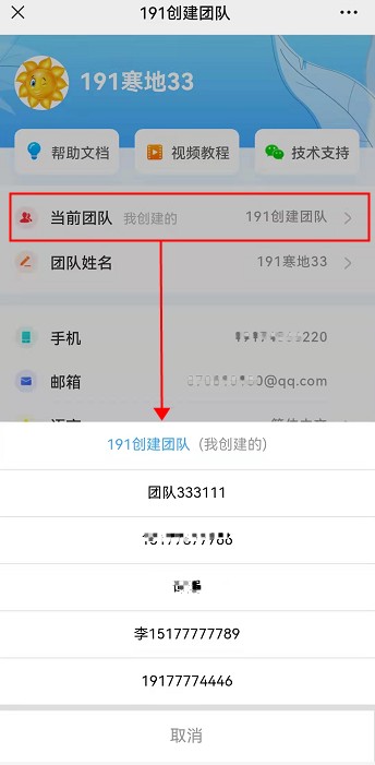 在个人中心可查看个人信息和团队信息,并且可以进行团队的切换。