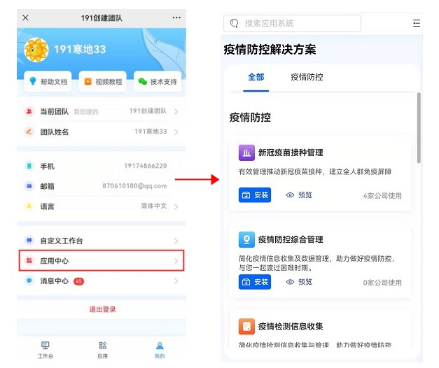 移动端的个人中心[即:我的]内可对当前账号进行管理,并可进行应用的安装和管理。