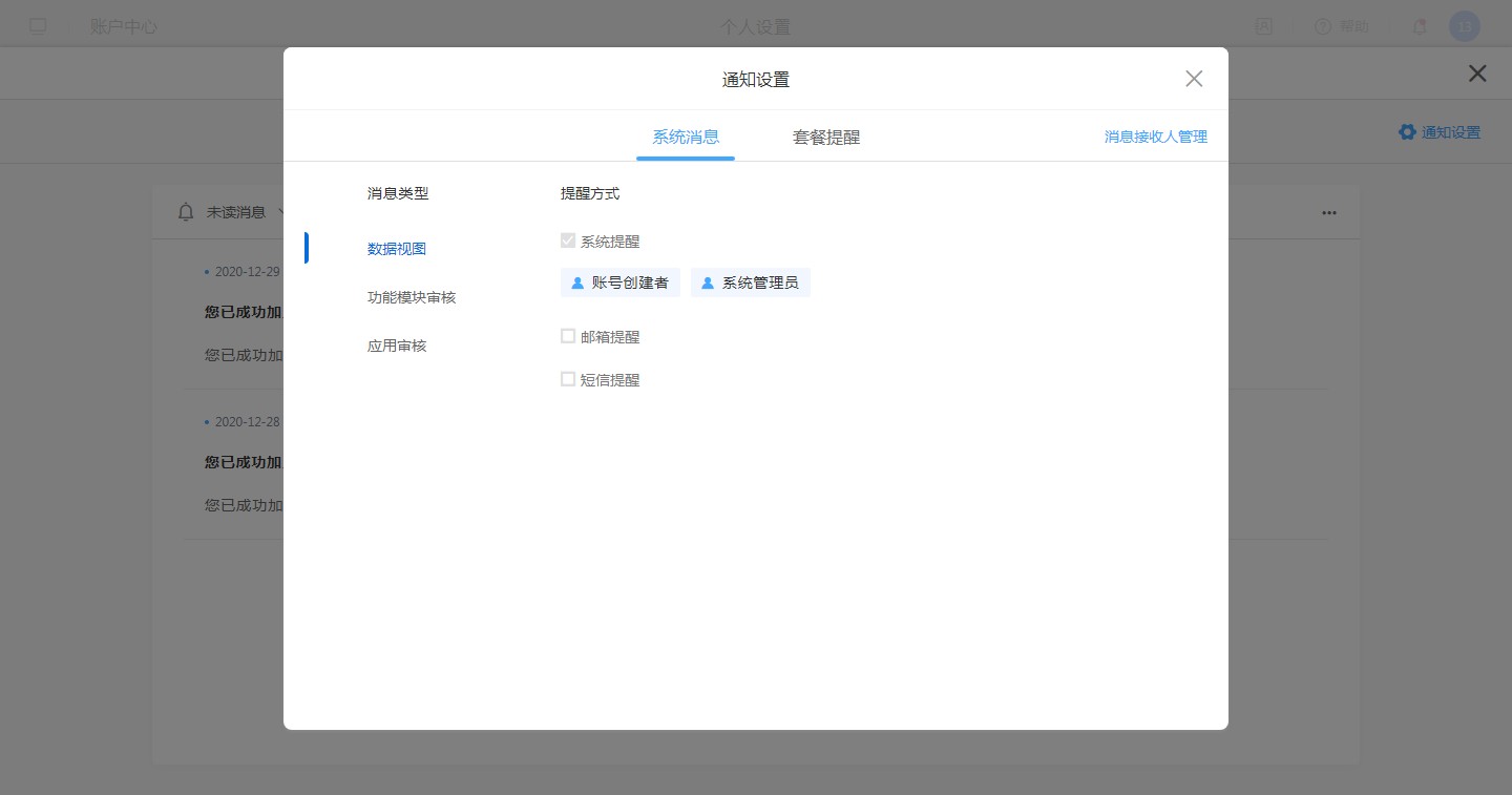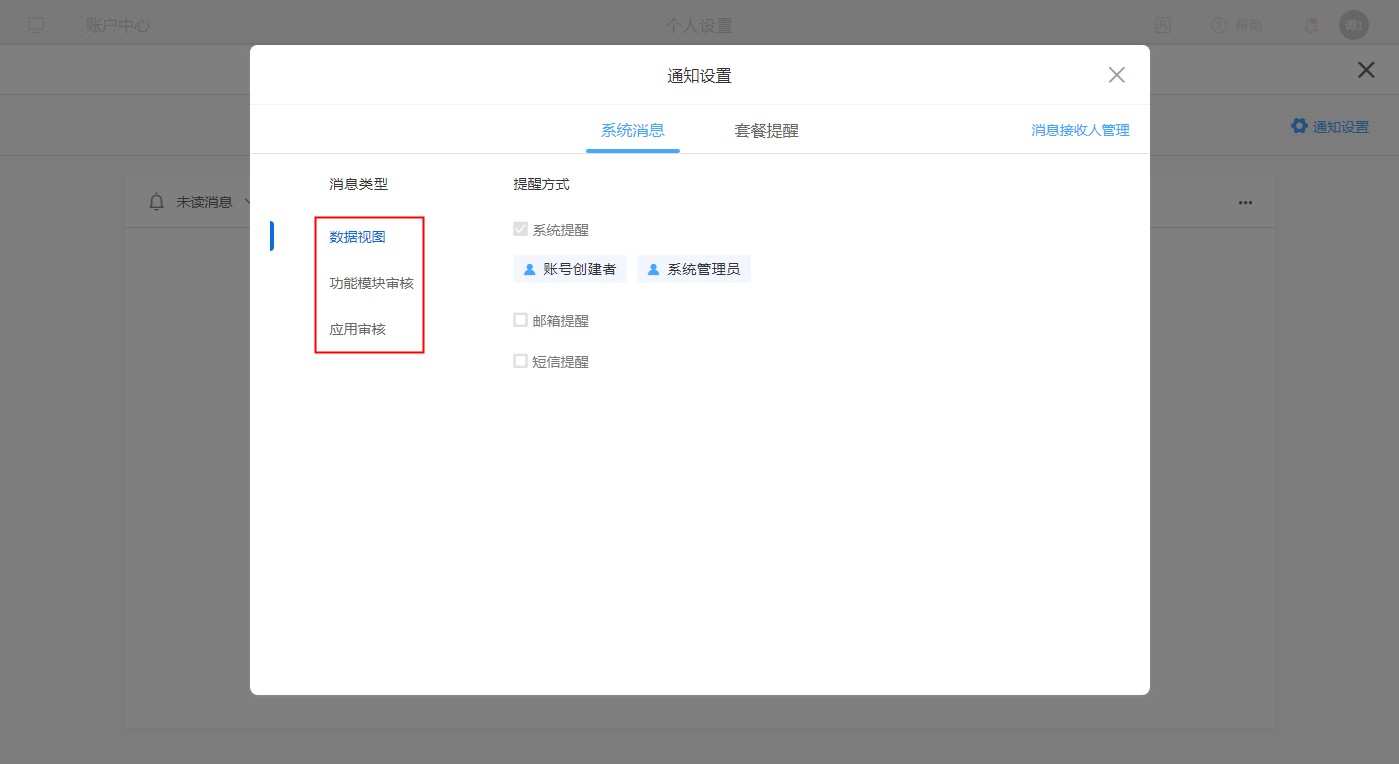 系统消息就包括数据视图执行失败的消息、功能插件审核以及应用审核通过与否的消息。