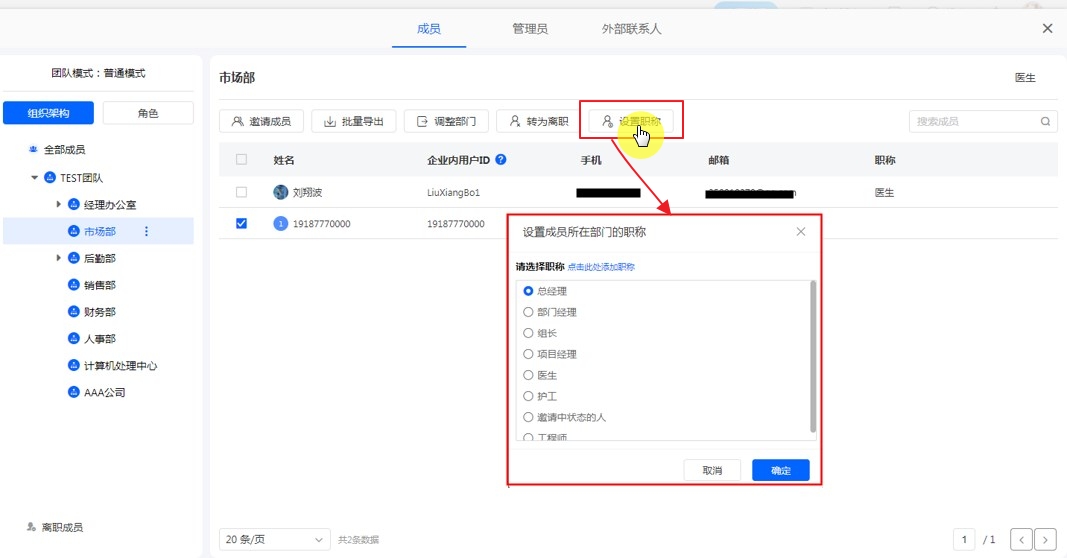 为选中的成员设置职称,当选中部门时显示【设置职称】入口。