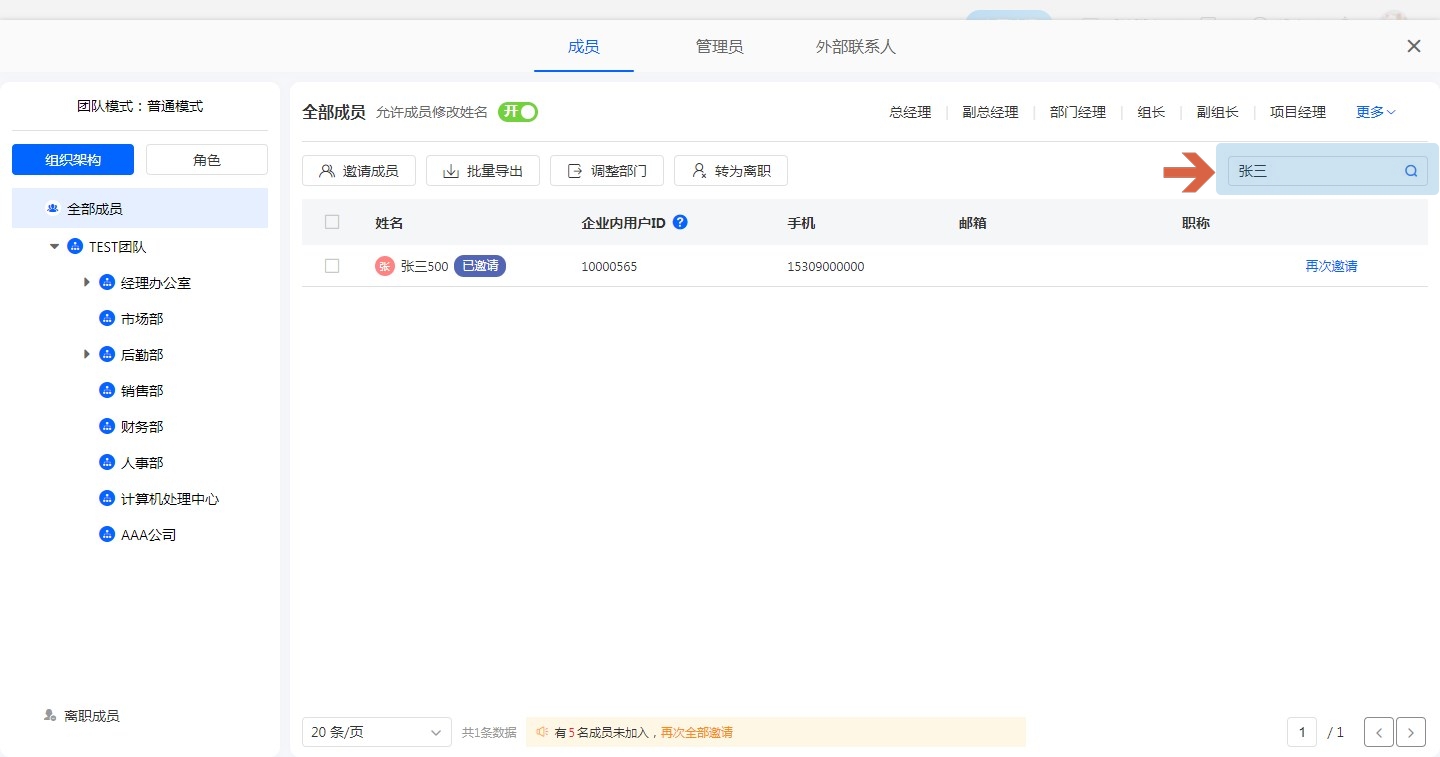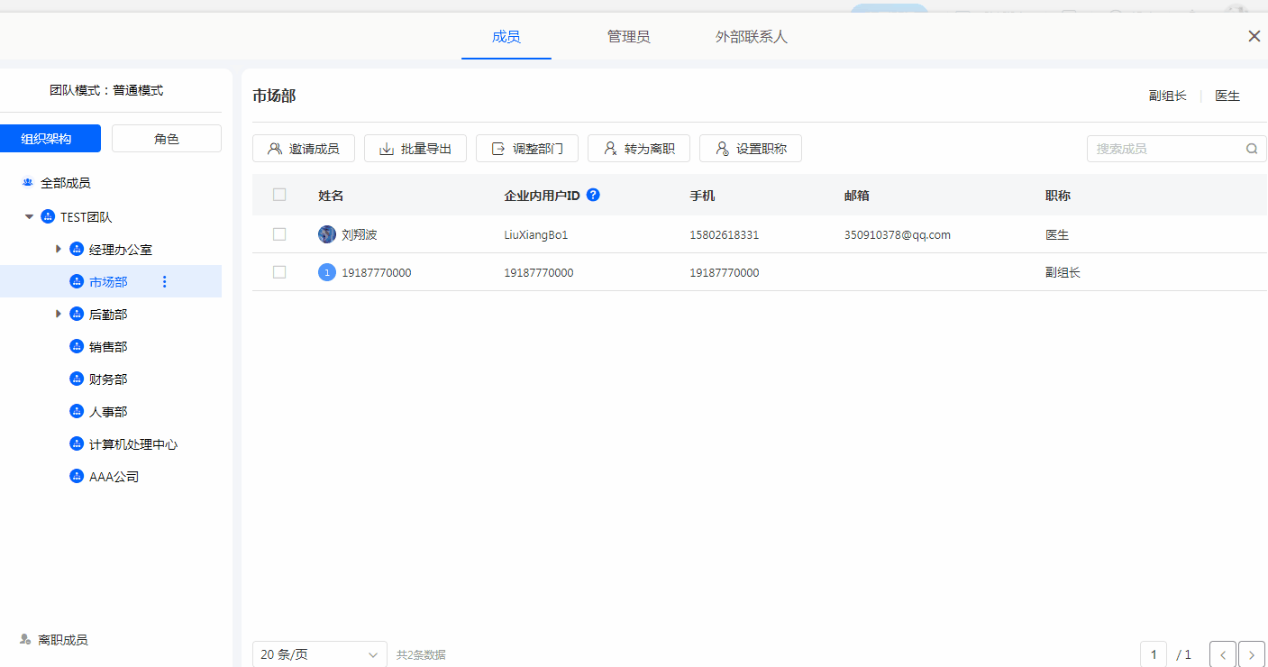 支持按姓名、手机、邮箱、职称进行模糊搜索,搜索范围为当前所选部门。