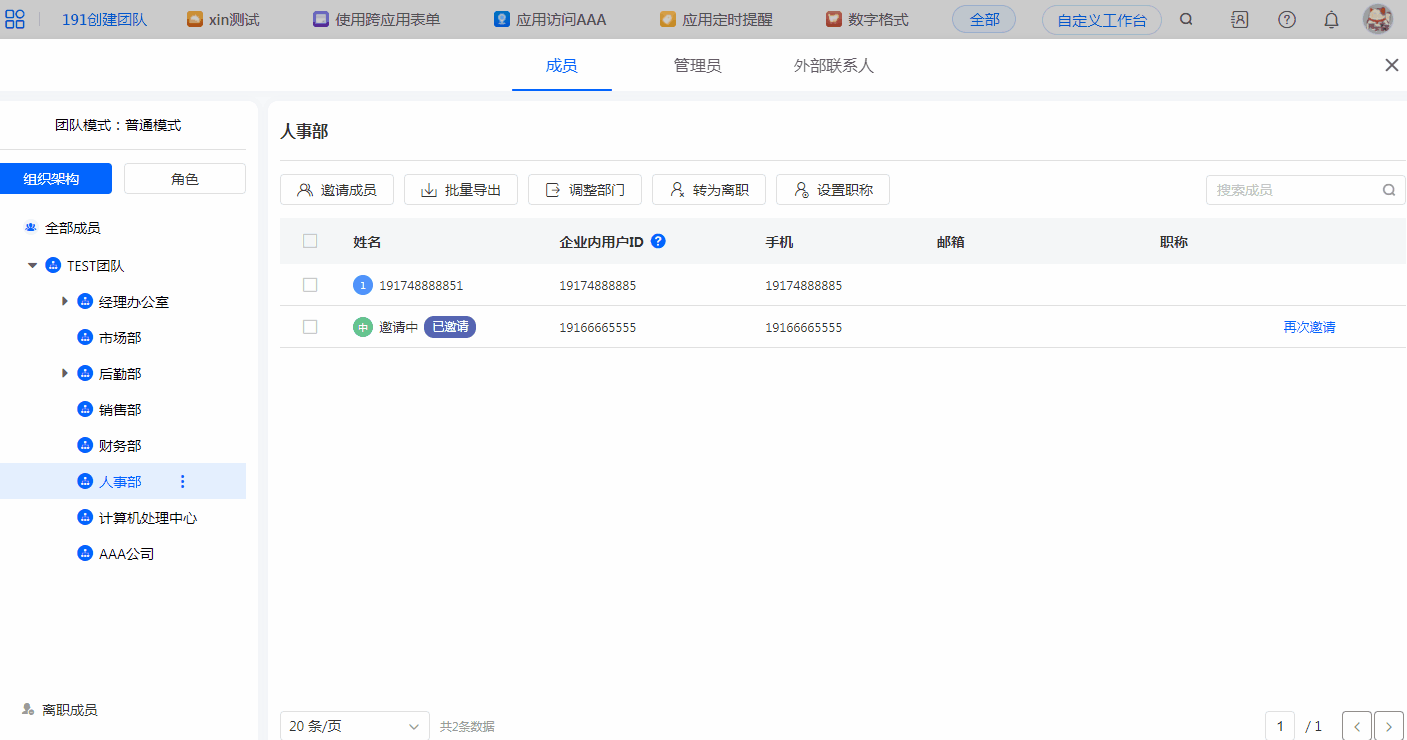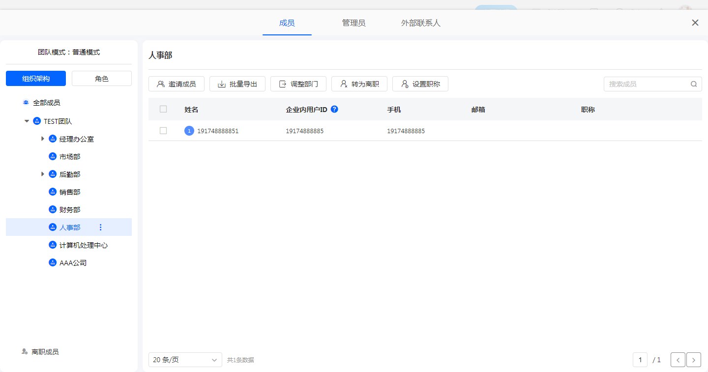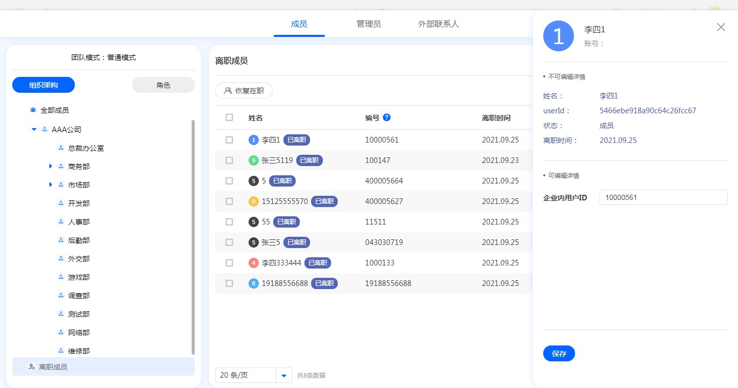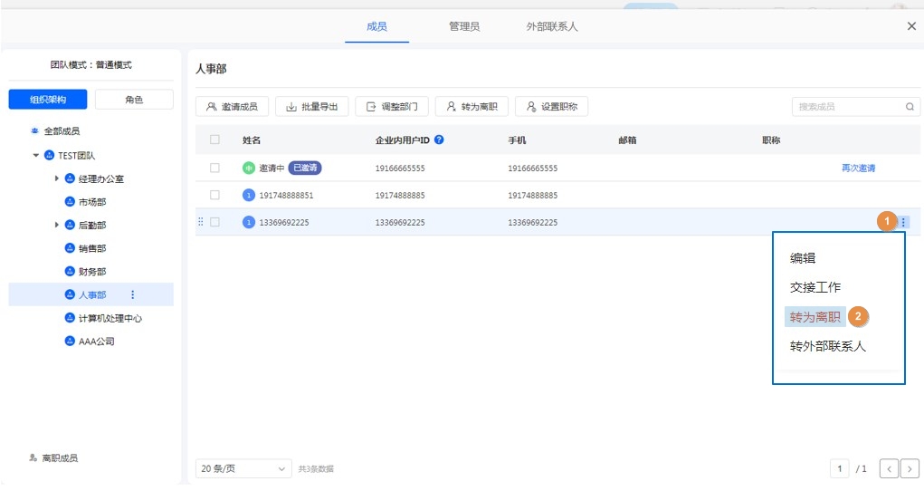 | 转为离职:对成员进行离职操作。 注意:创建者不能离职。 |