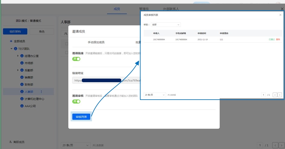 入口一:通讯录成员-邀请成员-公开链接邀请-审核列表