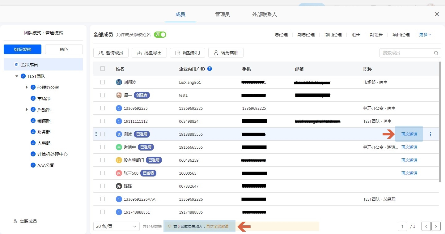 对于已经发出一次邀请但未加入团队的成员,可以在【成员】——【全部成员】——【再次全部邀请】,可对未加入团队的成员全部重新邀请。
