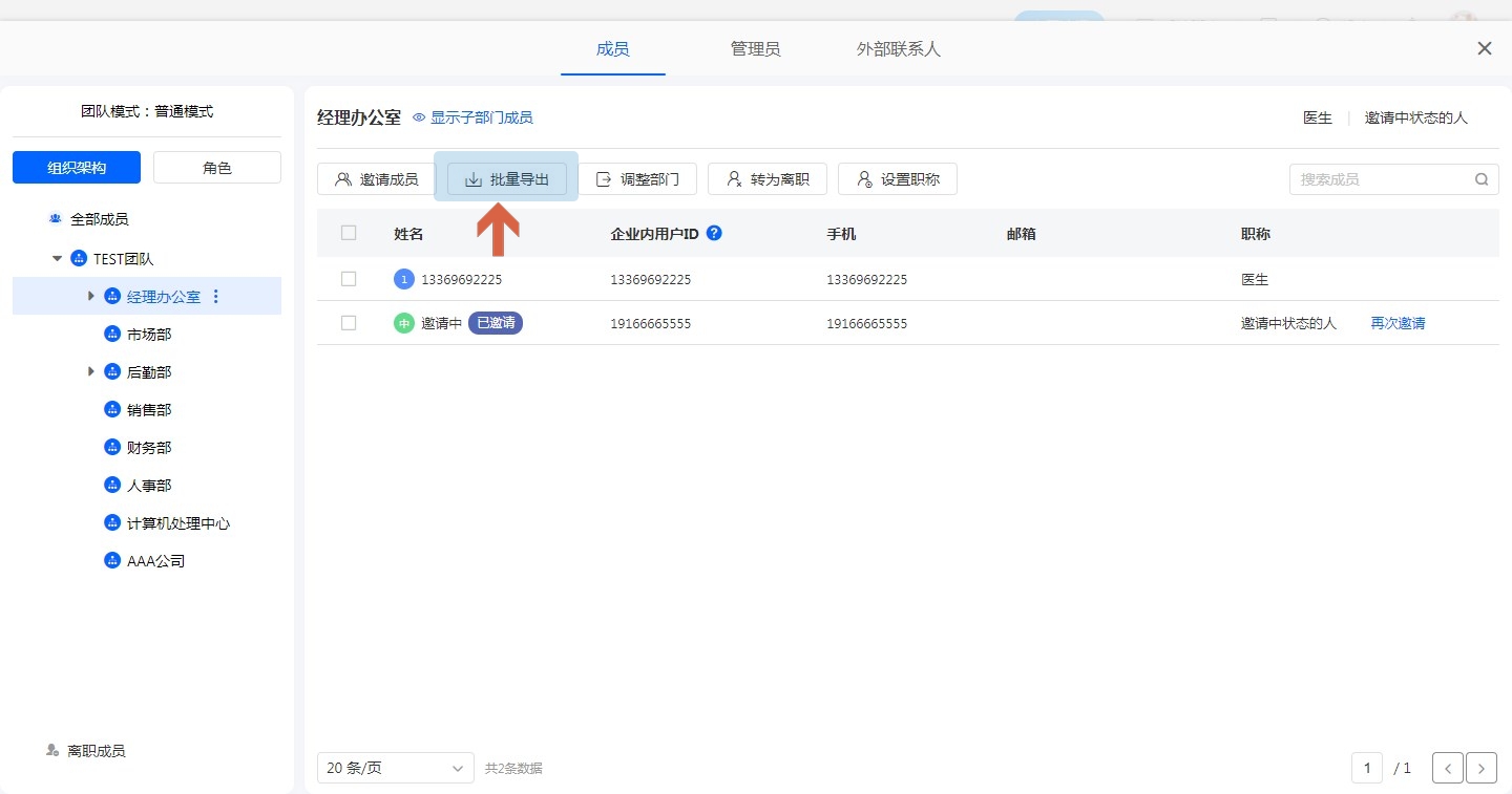 如需将成员信息导出到本地,可通过通讯录->批量导出,导出全部成员的信息。