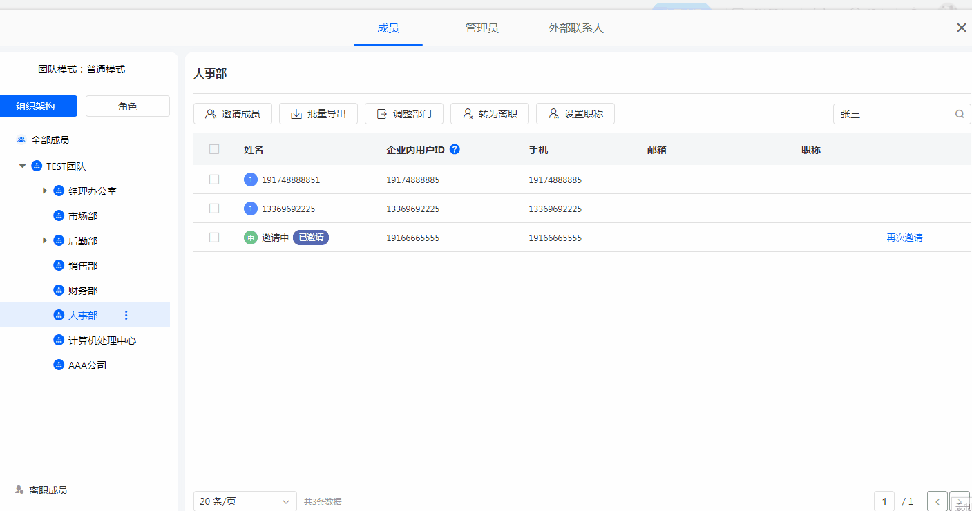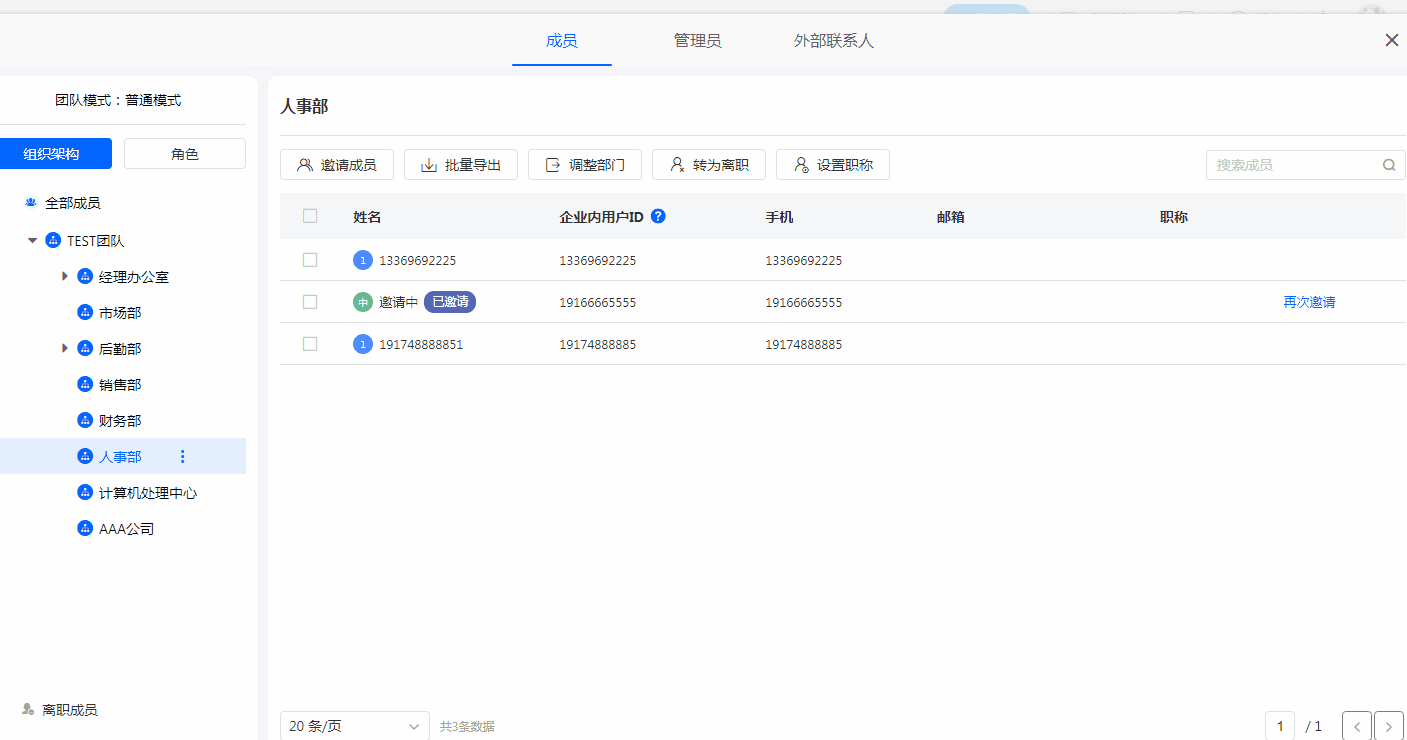 - 邀请中状态的成员只能删除,不能离职。
