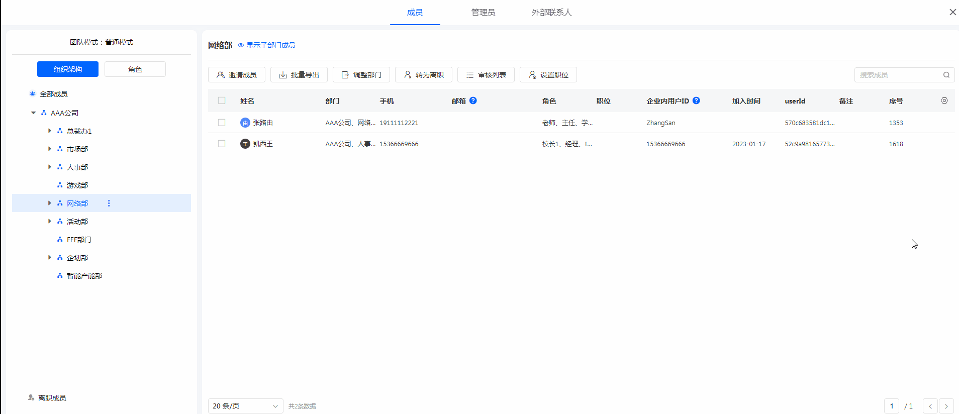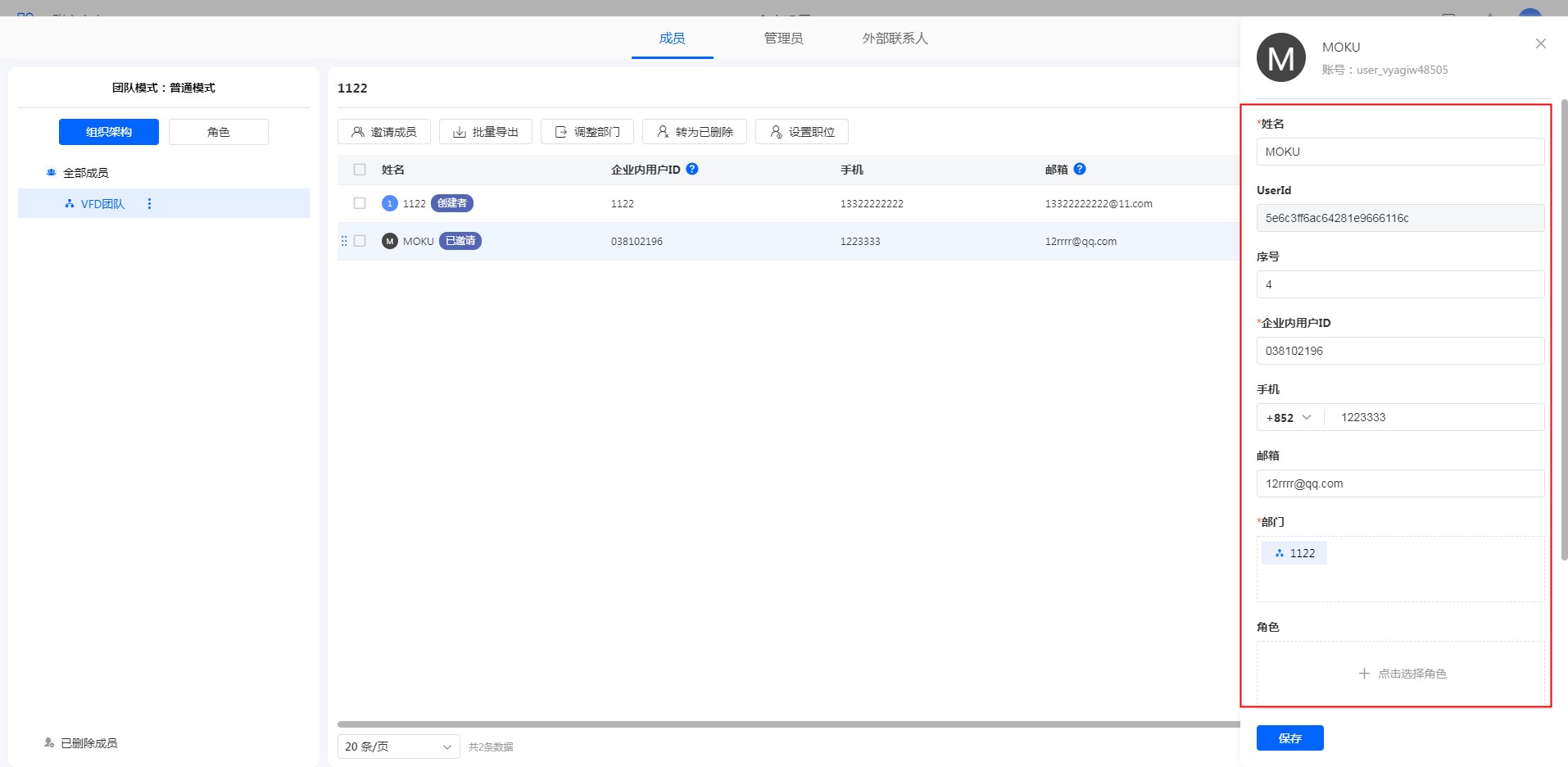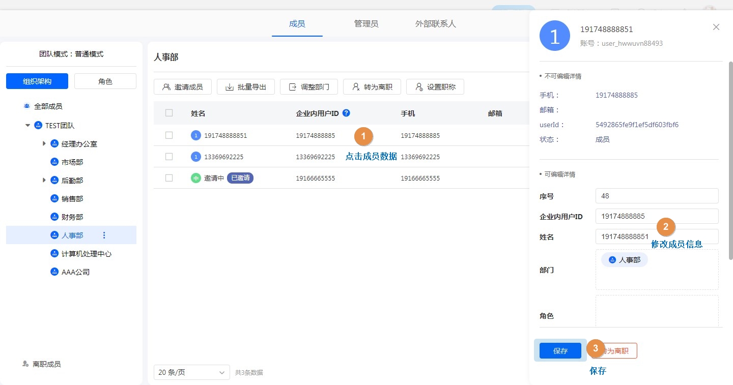 通讯录页面点击单条成员数据可以查看详情并进行姓名/企业ID/手机/邮箱/部门/角色/职称等信息的修改。