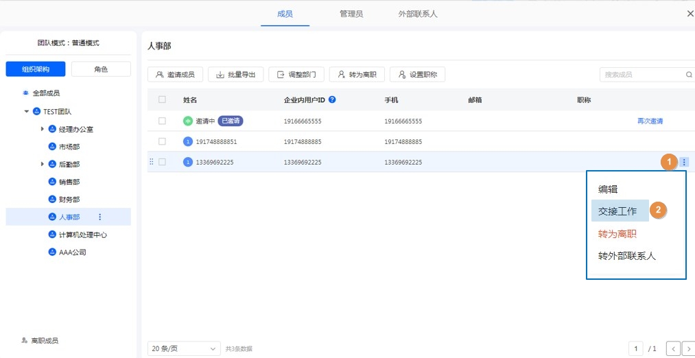 离职成员支持交接工作,详情参考交接工作。