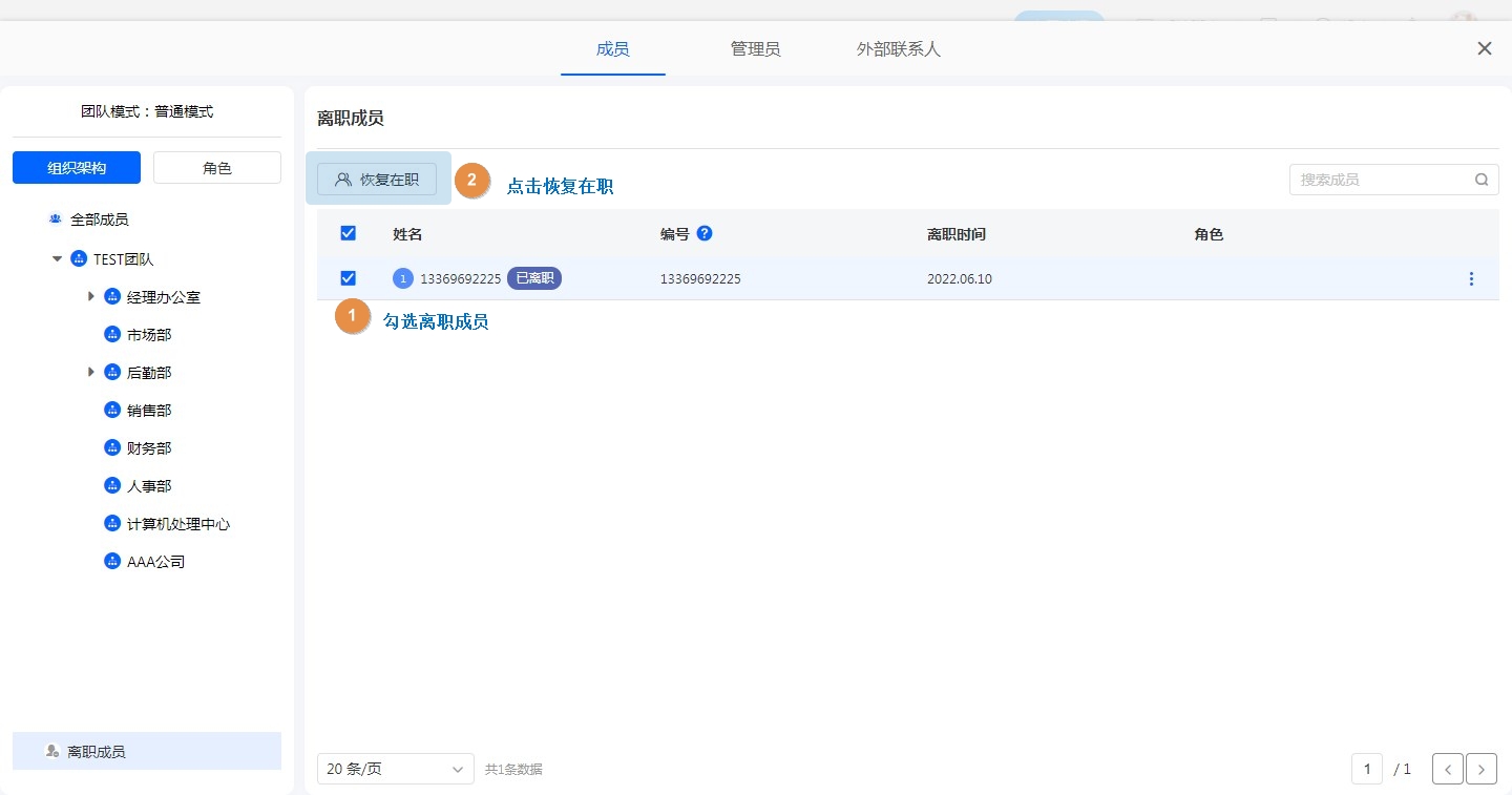 恢复在职可以将选中离职成员恢复到在职状态,部门恢复到顶级部门下。