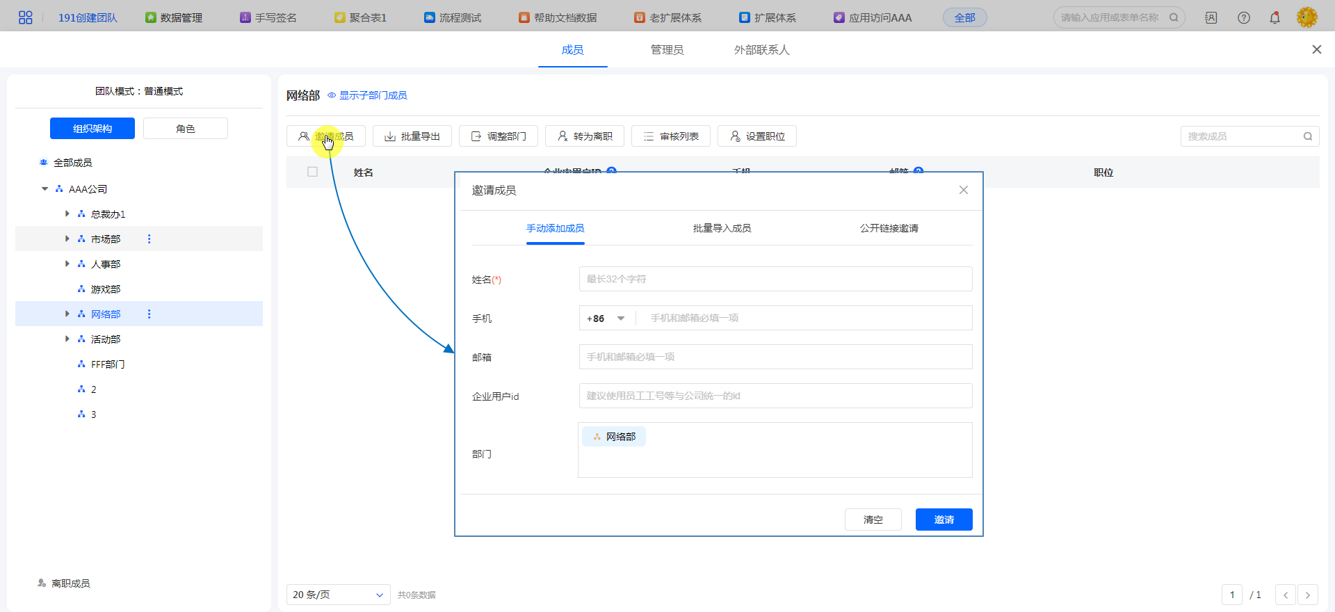 可通过在通讯录添加成员的手机号或邮箱进行邀请(邀请方式私有云可控制);成员收到邀请短信后,通过链接注册账号加入团队。