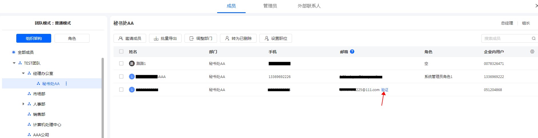 管理员在管理通讯录时,可以给未验证的手机或者邮箱发送验证信息;收到信息后,点击信息中的验证链接激活完成验证。