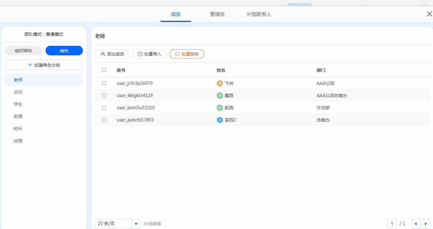 当员工职能发生变动后,常常需要将员工移除某一角色分组,可直接在角色页面进行成员的批量移除。
