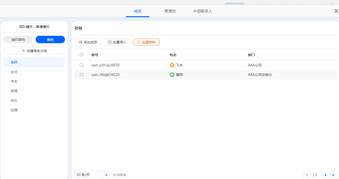为满足公司内跨部门协作的需求,平台在组织架构之外新增角色功能。