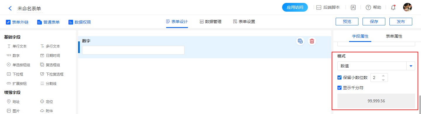 注意:数字字段的格式在以下场景不生效:关联数字主键字段显示、地图场景报表、统计类报表的维度。