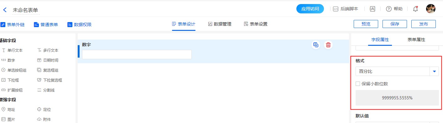 当数字类型设置为百分比格式,表单提交页直接输入百分比前面的数字部分即可;如果不是手动输入而是通过公式或其他方式计算得出来的数据,将自动换算成百分比的数字类型。