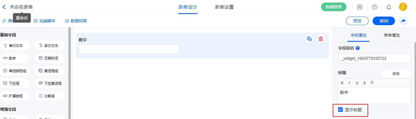 “字段别名”用于后端开发,默认为系统自动生成的随机字符串,可修改。