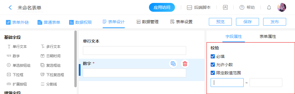 3. 特有功能“限定数值范围”,可以校验只允许填写指定范围内的数值。