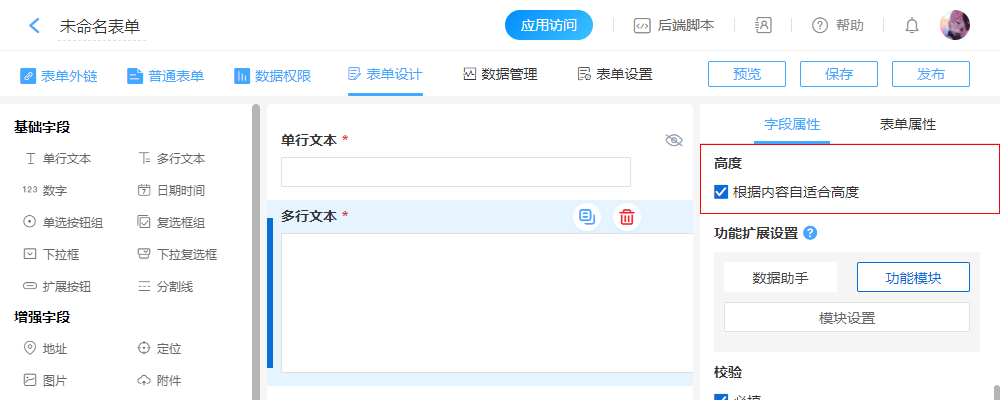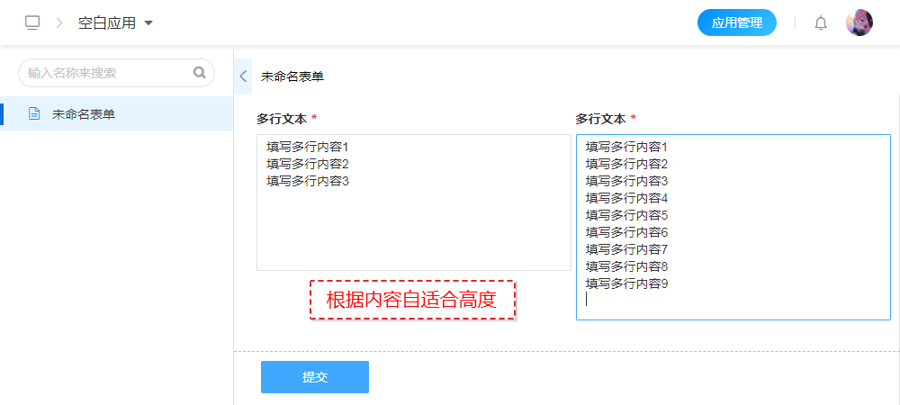 “多行文本”控件是表单基础控件当中唯一可以根据内容自动适合高度的控件,该属性更加方便大段内容填写与预览。