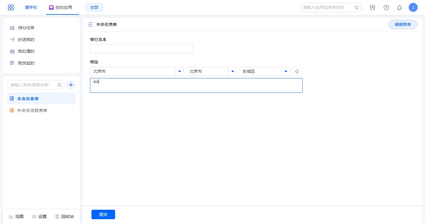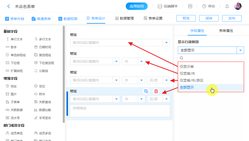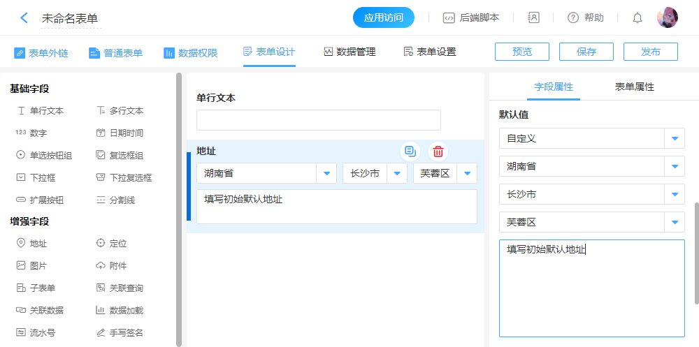 “地址”字段专门用来填写地址格式信息,其中“省、市、区”可以直接选择,无需手动填写,能够有效提高地址信息录入效率。