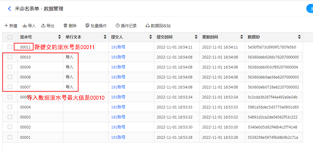 表单数据管理导入数据,导入Excel文件的流水号,如果符合表单流水号规则,那么导入数据的流水号也计入流水号递增序列中。