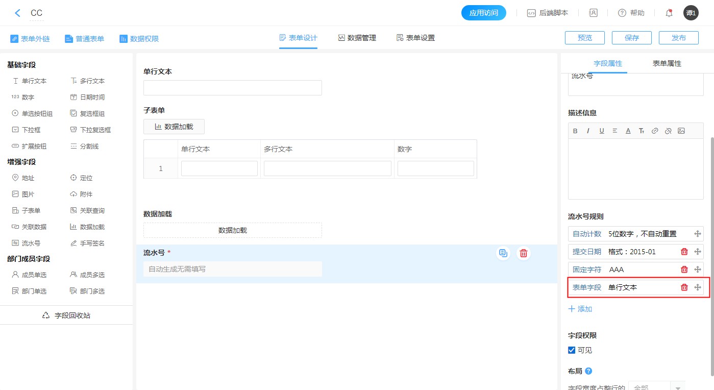 在使用流水号设计中,可能需要使用到表单中的字段来作为流水号的组成部分,那么添加表单字段即可实现。目前支持表单中的单行文本、数字、下拉框、单选按钮组作为流水号组成成分。