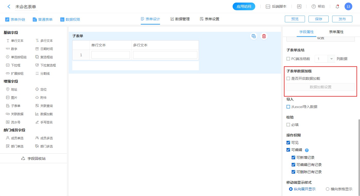 影响PC端,可以设置冻结子表单的前几列数据,当子表单字段过多时方便访问。