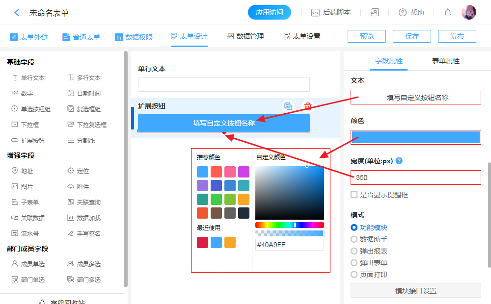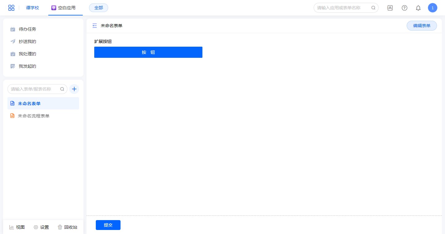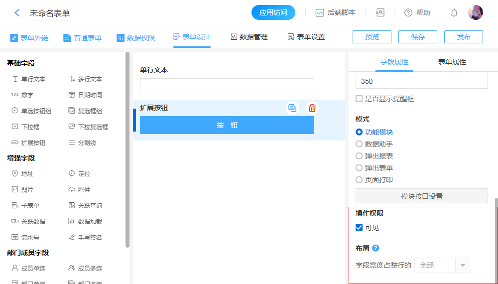 - 表单页面中创建一个独立按钮,用于执行“功能扩展”相关功能。