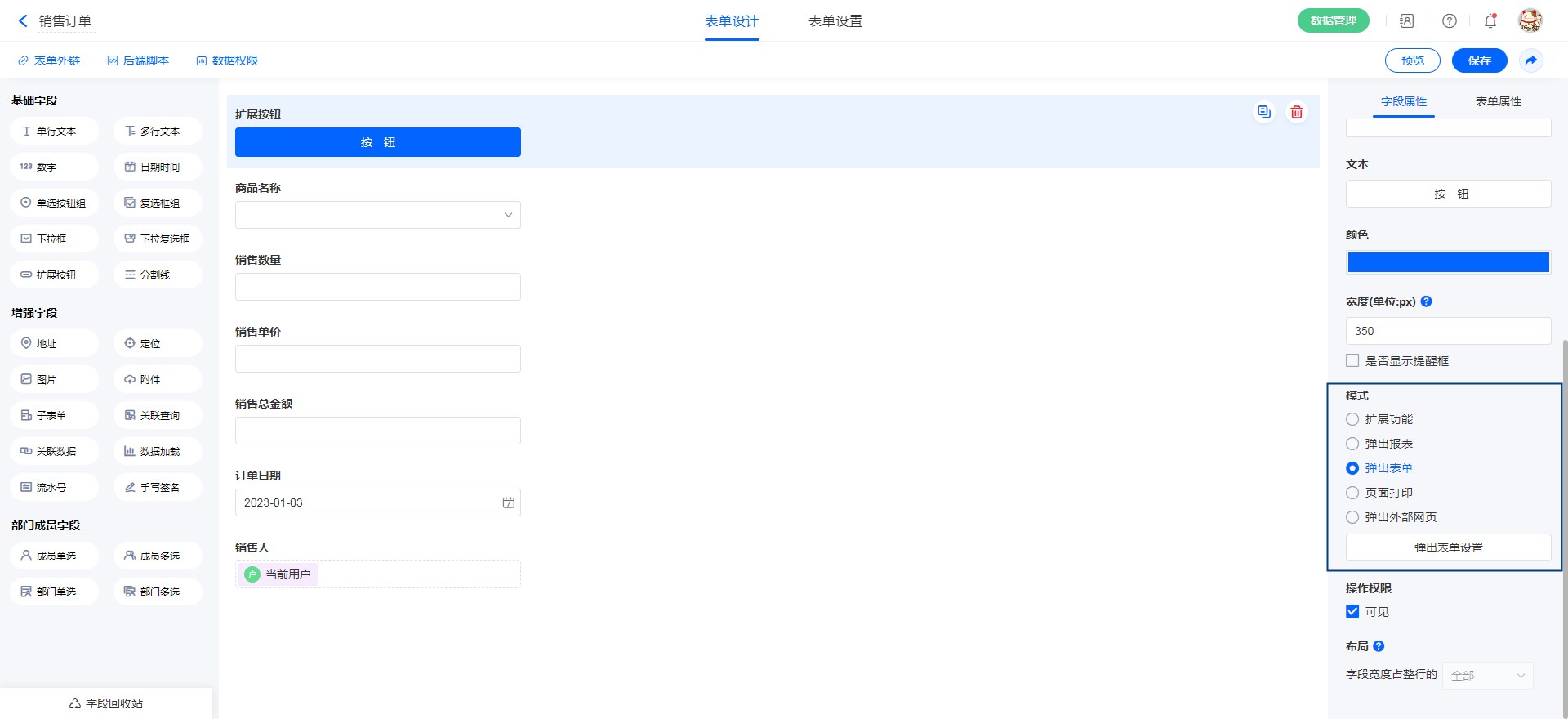 弹出表单是扩展按钮的最基本功能之一,设置扩展按钮的属性为弹出表单后,在用户点击扩展按钮时,会自动弹出指定的表单,并可根据需要,将当前页面的内容传递到被打开的页面中,在提交数据后,还可将指定内容返回到当前页面。
