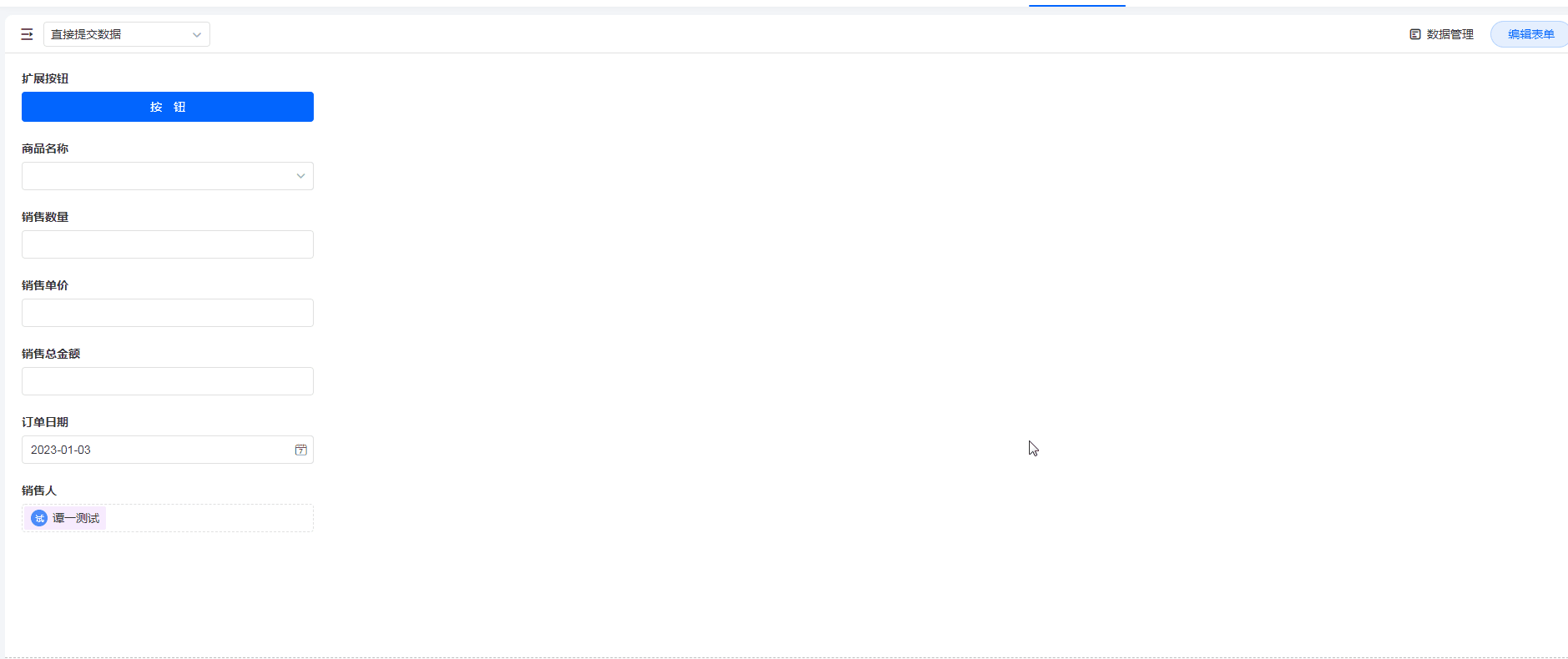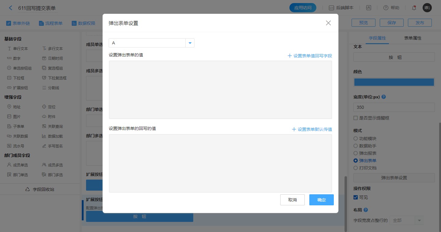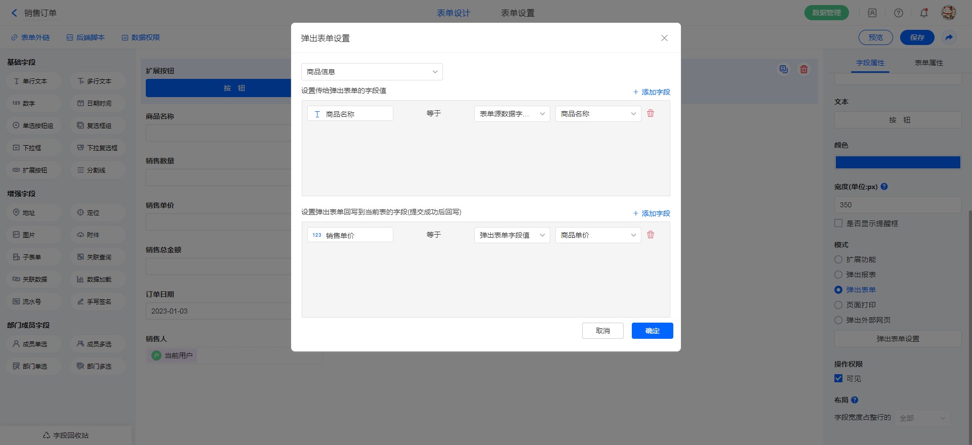 当前表单提交或编辑数据时,点击按钮,弹出表单,当前表单的字段值会自动回写到弹出表单对应的字段中。