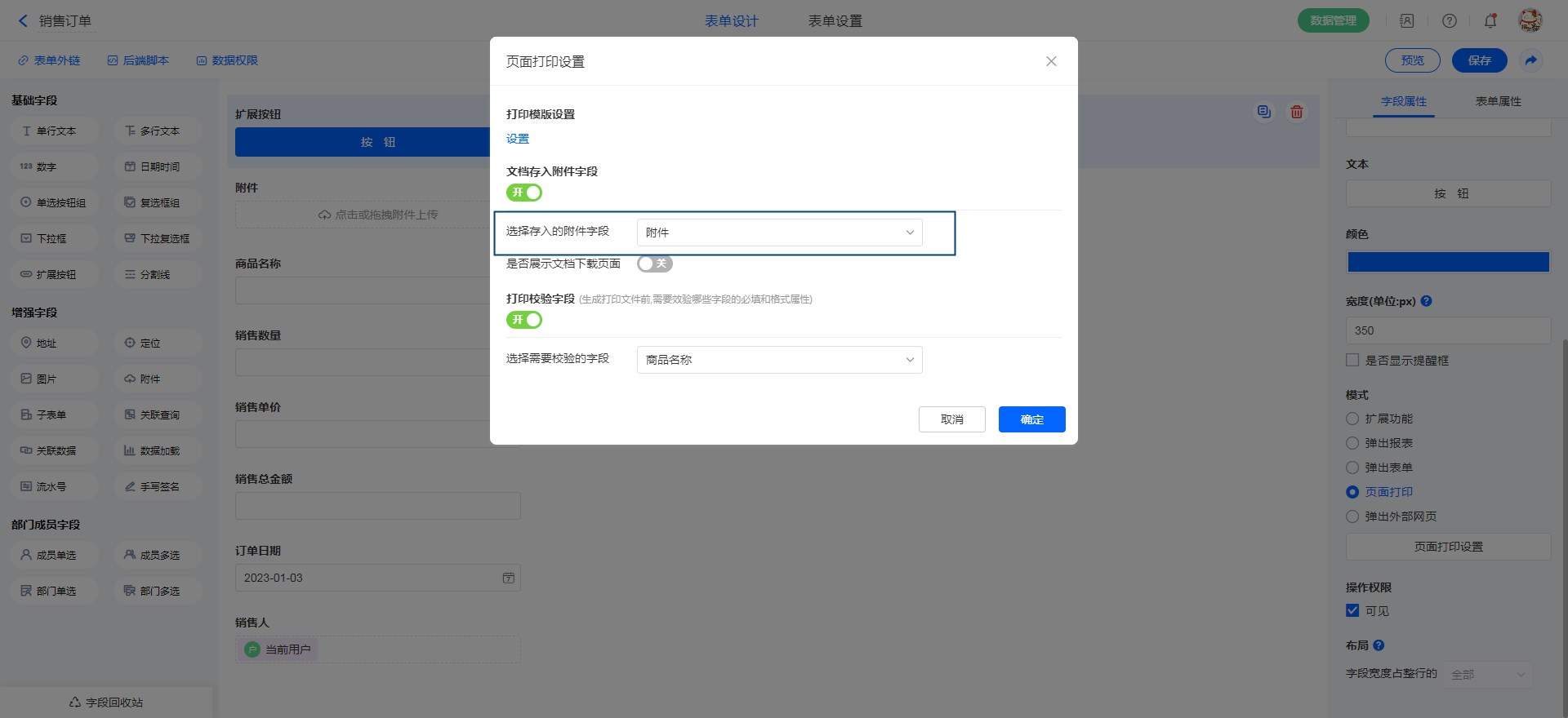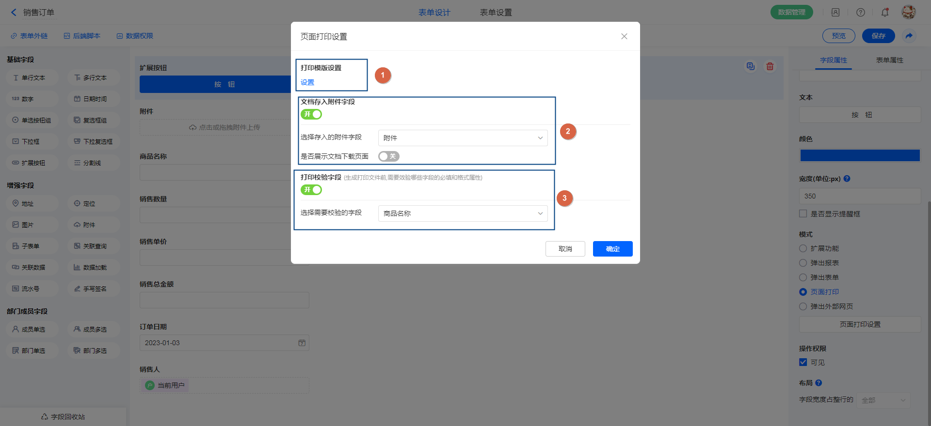 3. 打印校验字段设置:默认为"关",开启后,在点击按钮之前会对指定字段的必填和格式进行校验,如格式不正确,将无法打印。