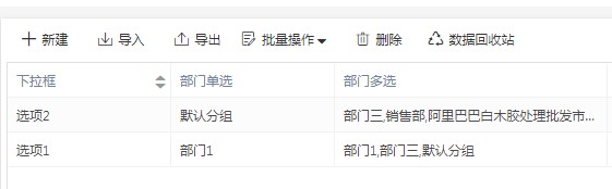 部门字段的默认值仅在可选范围为自定义时,会有默认值的设置,这个值只能从上面的【可选范围】的值中选择作为默认值。