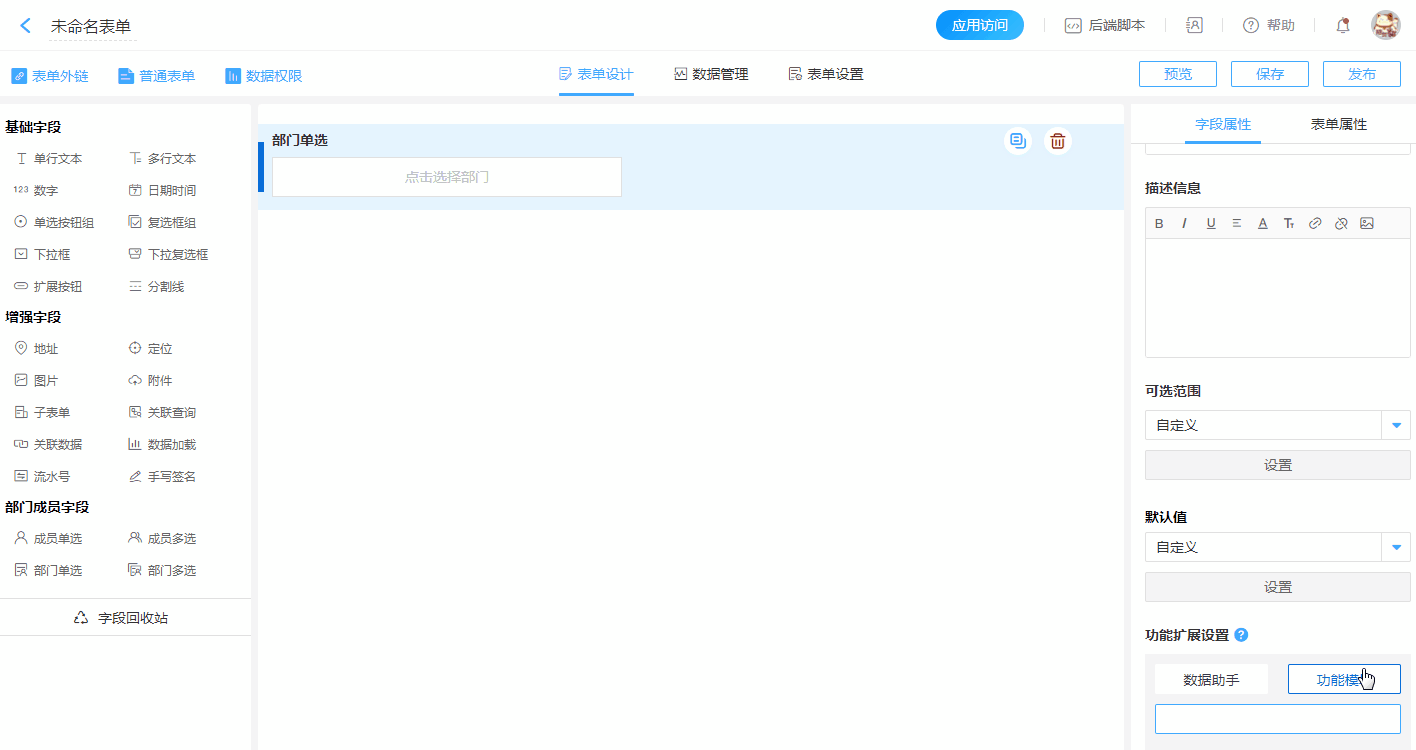 注意:表单外链不支持成员字段/部门字段,只有在系统数账号内访问表单,才可使用成员字段/部门字段。