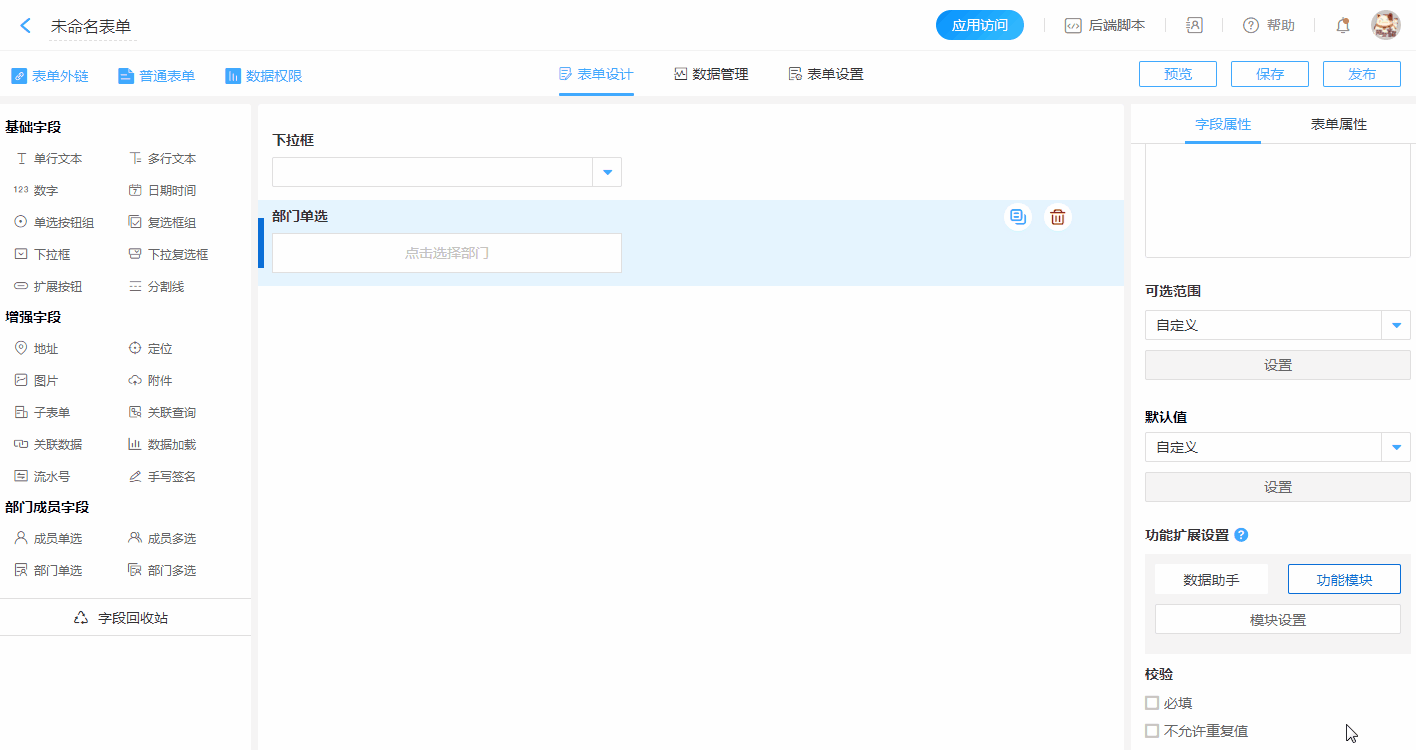 部门字段的可选范围如果设置数据联动,那么页面上不会展示默认值属性;可选范围为自定义时,页面会展示默认值属性。