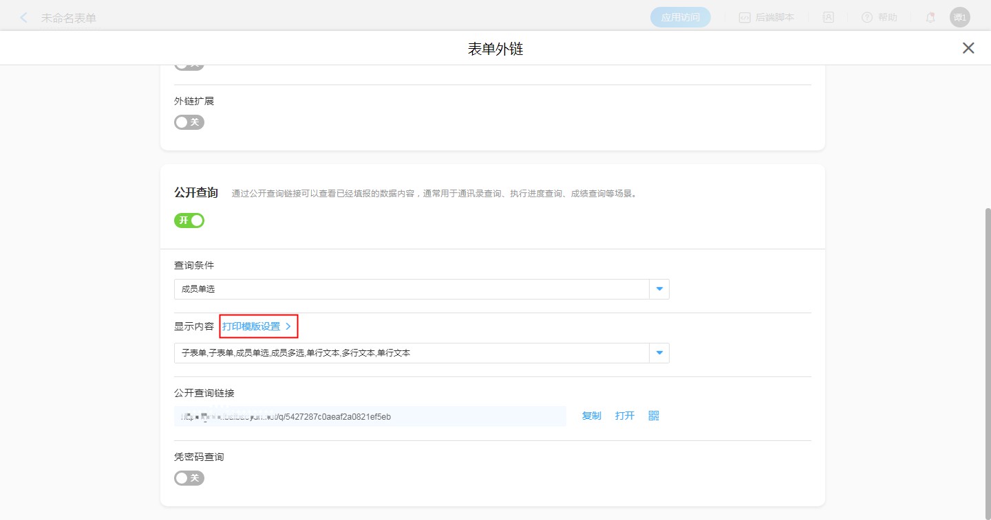 操作步骤:打开表单“设计页面” > 点击“外链” > 显示内容 > 打印模板设置,配置公开查询外链专属打印模板。