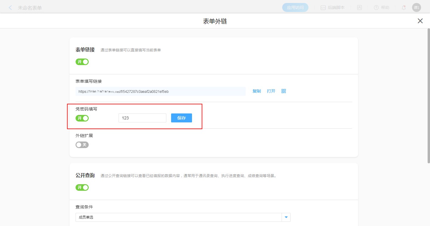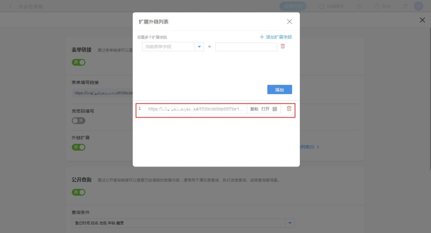 即可开启当前表单的外链功能,开启后,可以将链接或二维码发送给对应的人员。