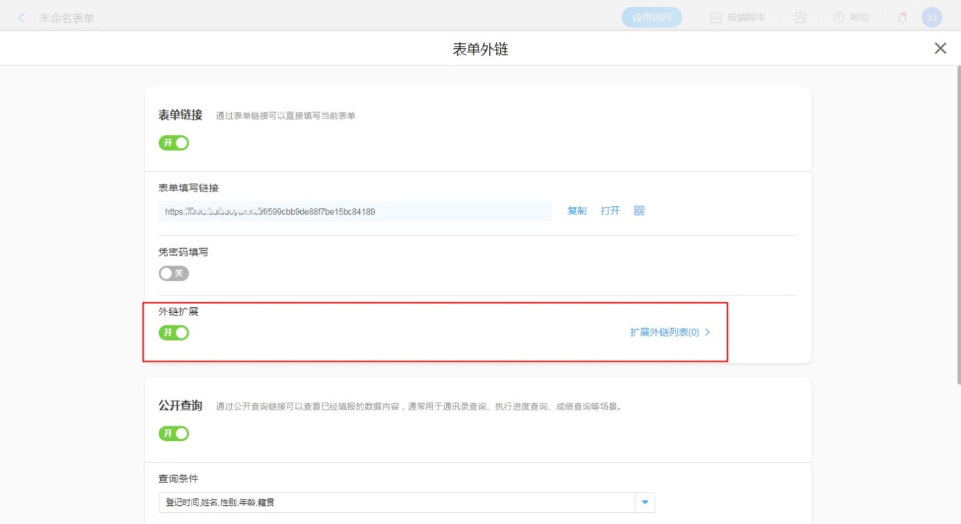 操作步骤:表单编辑页面 > 表单外链 > 开启“表单链接”开关