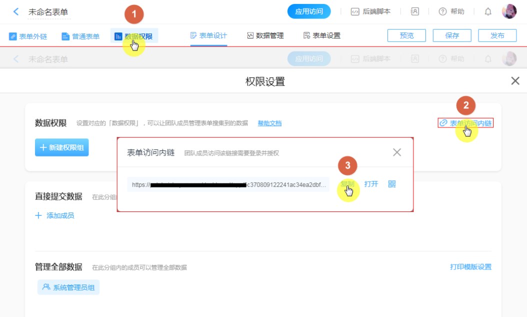 操作步骤:打开表单“编辑页面” > 数据权限 > 打开“表单访问内链”,即可获取内链地址。