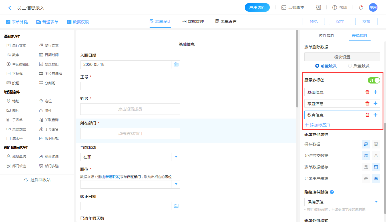 操作步骤:表单编辑页面->表单属性->多标签显示->开启。