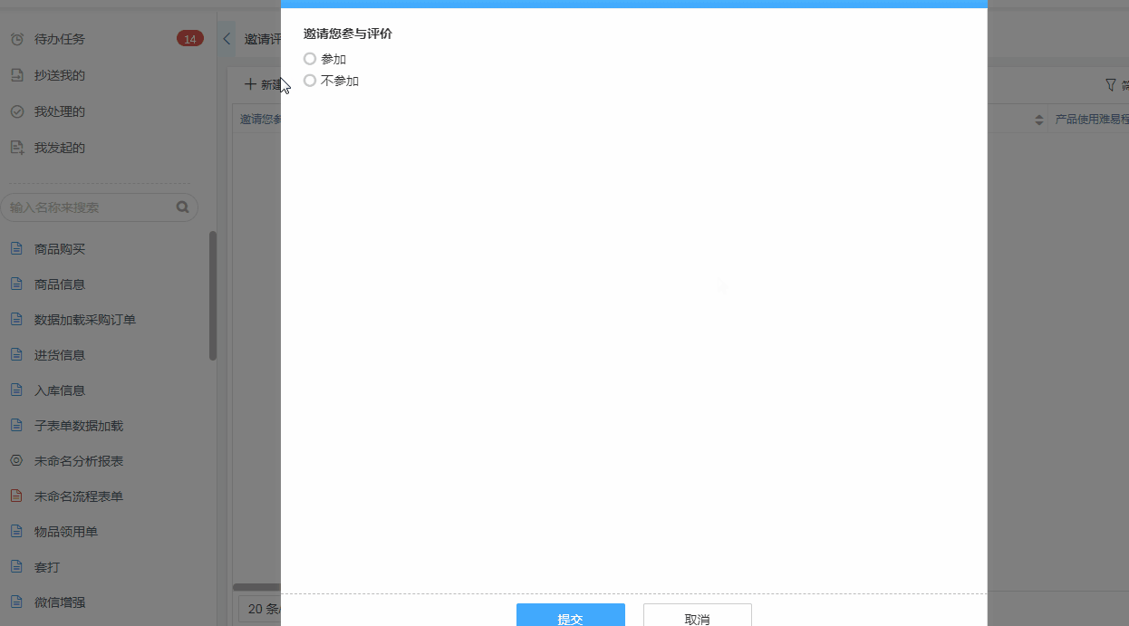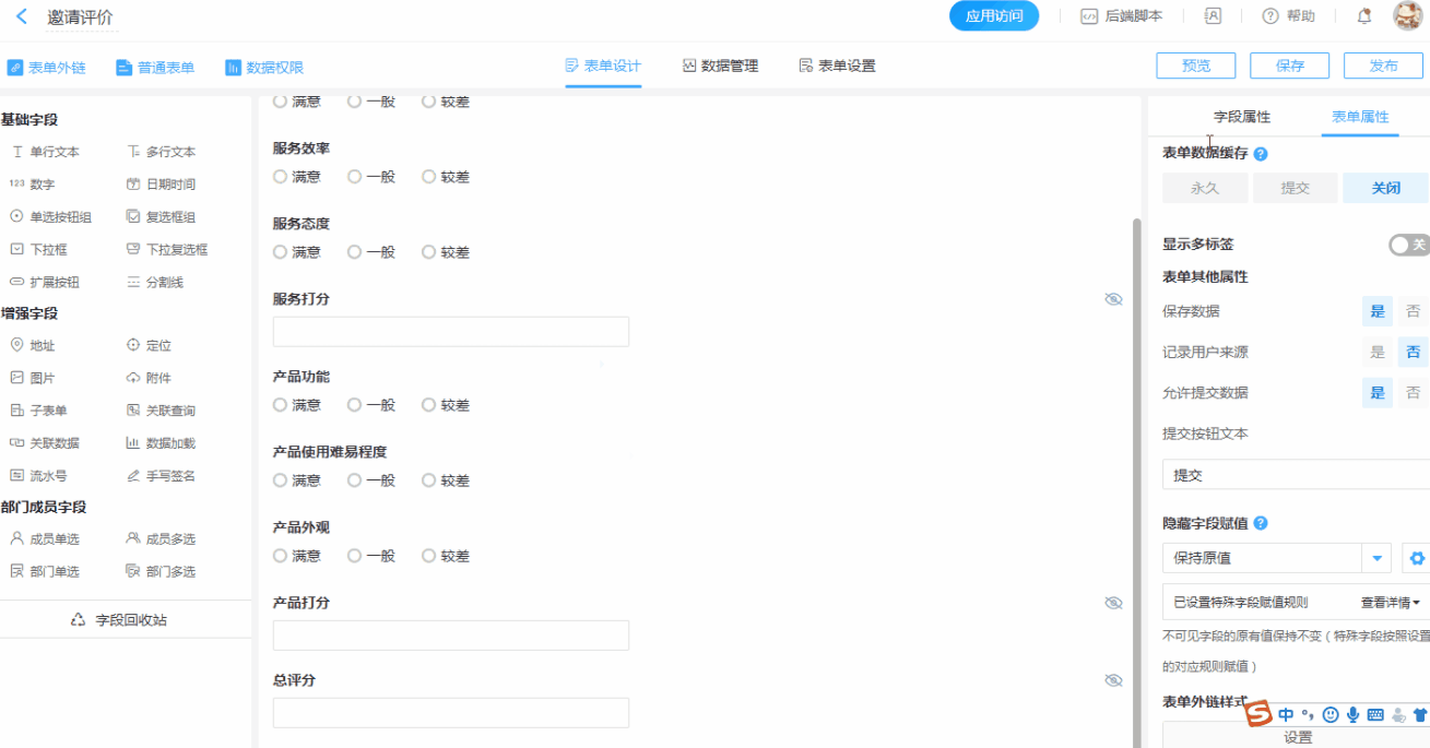 1、邀请评价表单,当参加评价时,会显示【服务内容】、【服务效率】、【服务态度】、【产品功能】、【产品使用难易程度】、【产品外观】字段。 无论参不参与评价,【服务打分】、【产品打分】、【总评分】字段始终隐藏,不给提交人员展示。