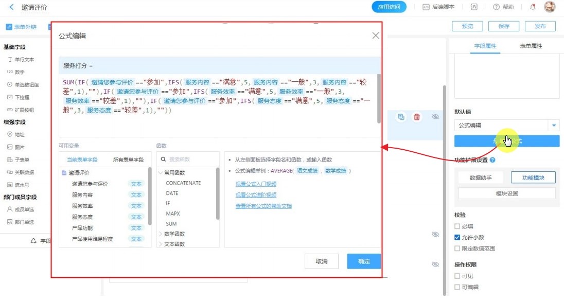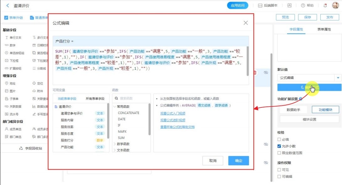 2、隐藏字段赋值设计,参加评价和不参加评价下显示了不同的内容,所以被控制显示隐藏的字段需设置 空值,以确保只录入最终选择了的数据。 打分和总分字段采用公式计算,在录入界面对填报人不可见,但需要提交入库,所以该字段需要设置 不可见字段始终重新计算 。